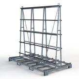 Fenster- und Elementetransportgestell mit erweiterter Auflagebreite zum Einsatz als Anhängergestell mit gummierten Auflagen und gummierten Anlagen.