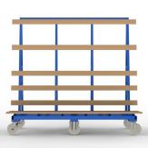Jumbo Rollwagen für Glastafeln in den Größen bis max. 3.210 x 2.450 mm, ausgestattet mit einer Mittelachse und Schwerlast – Lenkrollen.
