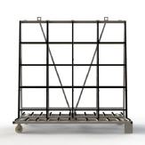 Glastransportwagen für beidseitige Beladung, vorgerüstet für die Aufnahme von Gurtspannlatten mit Lochraster, Gurtoesen sowie Außenkranoesen, stirnseitig angebrachten Bockrollen mit gegenüberliegender Kugelpfanne.