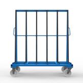 Glastransport- und Kommissionswagen für einseitige Beladung in lackierter Ausführung mit gummierten An- und Auflagen für den internen Einsatz mit je 4 Polyamidrollen.