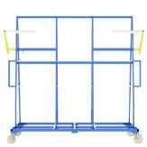 Schwerlast-Kistenwagen für den internen Transport von Glaskisten bzw. Caps, ausgerüstet mit einer Mittelachse, (Schwerlasträder), 4 stirnseitig angebrachten Schwerlast- Lenkrollen (2x Stop) aus Polyamid und mit verstellbaren selbstarretierenden Seitenhaltern. Die Anlagen sind vorgesetzt, sodass die Caps- oder Kistenhölzer wegtauchen und das Glas nicht hinterfüttert werden muss. Die Bodenfreiheit beträgt aufgrund der Bauform max. 40 mm, sodass Sie bei einem optionalen Kistenmaß von z.B. 2.340 mm Höhe eine beladene Gesamthöhe von max. 2.460 mm erreichen.