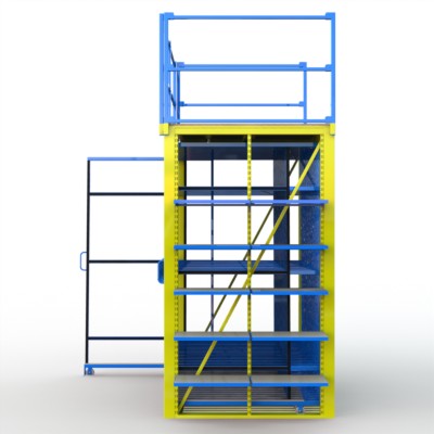 Lagerbühne mit abnehmbarem Schutzgeländer, sowie einstig mit verstellbaren Regalfachböden.