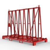 Glastransportgestell für beidseitige Beladung kranbar, mit Staplerfüßen und Kippsicherungen, Gurtoesen und Lochraster für den Einsatz von Gurtspannlatten.