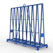 Glastransportgestell für beidseitige Beladung kranbar, mit Staplerfüßen und Kippsicherungen, Gurtoesen und Lochraster für den Einsatz von Gurtspannlatten.
