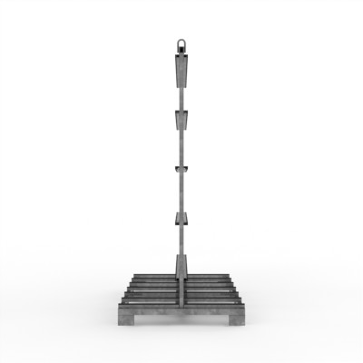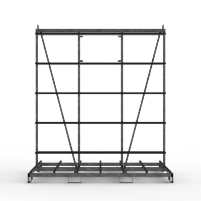 Elemente-Transportgestell Typ T (T-Gestell), zur beidseitigen Beladung mit senkrechter, gummierter Rückenanlage und gummierten Auflagen, staplerfähig und kranbar.
