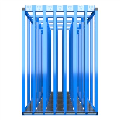 Tafel- und Plattenlager für Bleche, Kunststoffplatten, Verbund- und Spanplatten. Modular erweiterbar. Grundmodul für Klein- und Mittelformate mit 7 Einstellfächer. Fachbreite 100 mm oder 200 mm. Bodenauflage in dreit Varianten Möglich, als Siebdruckplatte, als OSB mit verzinktem Blech belegt und als Polyamidauflage. Alle Einstellfächer verfügen frontseitig über eine verzinkte Stahlrolle als Entnahmehilfe. Optional können die Einstellfächer mit seitlichen Fachführungen in Holz, Polyamid oder Stahlblech ausgestattet werden. Zusätzlich kann der obere Modulrahmen als Lagerbühne mit 200 kg/m2 ausgerüstet werden.