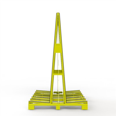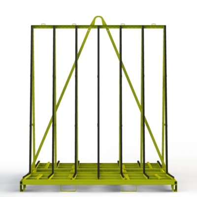 Fenster- und Elementetransportgestell mit erweiterter Auflagebreite zum Einsatz als Anhängergestell mit gummierten Auflagen und gummierten Anlagen.