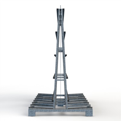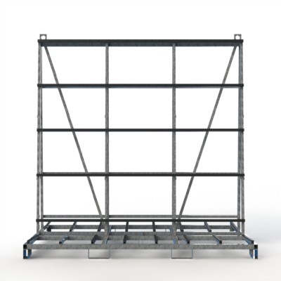 Fenster- und Elementetransportgestell mit erweiterter Auflagebreite zum Einsatz als Anhängergestell mit gummierten Auflagen und gummierten Anlagen.