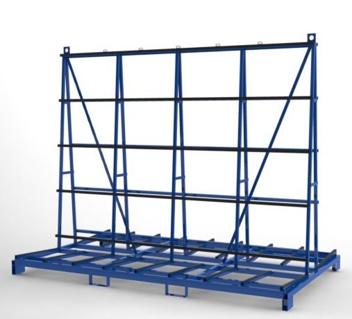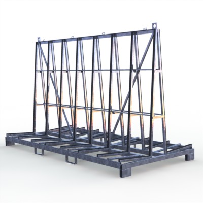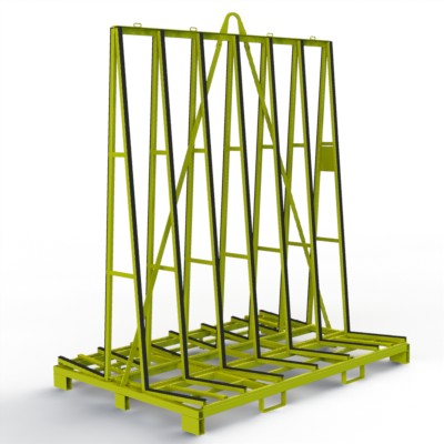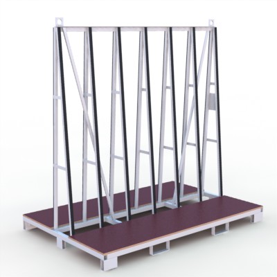 Fenster- und Elementetransportgestell mit erweiterter Auflagebreite mit gummierten Auflagen und gummierten Queranlagen.