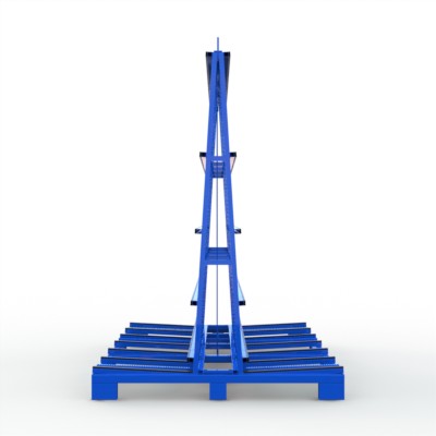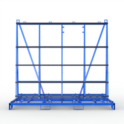 Elemente- und Fenstertransportgestell zur beidseitigen Beladung in verzinkter Ausführung mit je 5 Queranlagen und Außenkranoesen, optional mit Lochraster und Gurtoesen für den Einsatz von Gurtspannlatten.