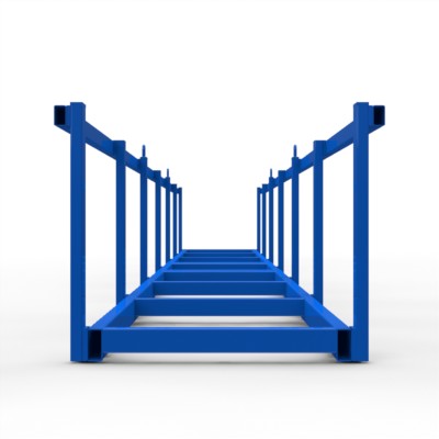 Platzsparend stapelbare Langgutpalette, kranbar und staplerfähig. Optional mit gummierten Auf- und Anlagen, Weichholzauf- und Anlagen, Anlagen und Auflagen in polyurethan. Ausführung lackiert oder verzinkt.