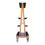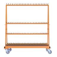 Rahmenzuschnitt- u. Kommissionierwagen (Glasleistensortierwagen] beidseitig beladbar mit fest vorgegebenen Kommissionsbreiten für max. 25 Einstellkommissionen bzw. für Einstellbreiten von 45 mm bis 55 mm je Trennfach.