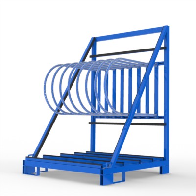 Transportgestell für Türenelemente , mit flexibel einstellbaren Bügelfächern, Stapler-und hubwagenfähig.