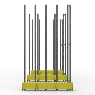 Grundelement FGL Kistenigel bestehend aus zwei parallel verlaufender Kistenschienen mit variablen Einsteckmöglichkeiten für Glaskisten und Caps bis 2.450 mm Glashöhe, erweiterbar mit Anbauelementen.