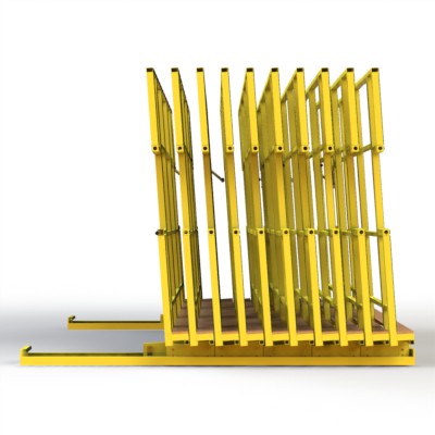 FGL Querlagersystem mit 10 Einstellplätzen für Glasgrößen bis 3.210 x 2.250 /2.550 mm bis 2.200 kg Fachbelastung.