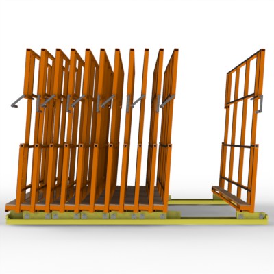Querlagersystem mit 12 Einstellplätzen für Glasgrößen bis 3.210 x 2.250 /2.550 mm bis 2.500 kg Fachbelastung.
