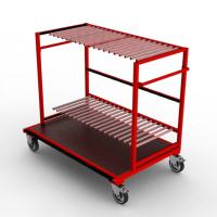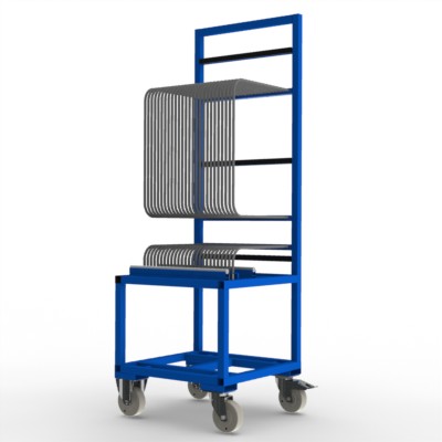 Rähmchenwagen für die Kommissionierung von Isolierglaseinfassungen mit 2 verstellbaren Kammreihen.