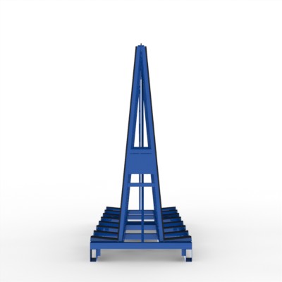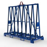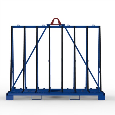 Glastransportgestell für beidseitige Beladung kranbar, mit Staplerfüßen und Kippsicherungen, Gurtoesen und Lochraster für den Einsatz von Gurtspannlatten.