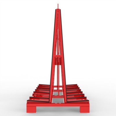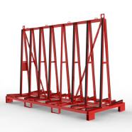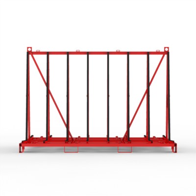 Glastransportgestell für beidseitige Beladung kranbar, mit Staplerfüßen und Kippsicherungen, Gurtoesen und Lochraster für den Einsatz von Gurtspannlatten.