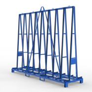 Glastransportgestell für beidseitige Beladung kranbar, mit Staplerfüßen und Kippsicherungen, Gurtoesen und Lochraster für den Einsatz von Gurtspannlatten.