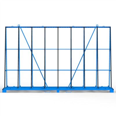 Glastransportgestell für beidseitige Beladung, kranbar mit Unterlochraster für *optionale Gurtspannlatten, Kippsicherungen und Staplerfüßen.