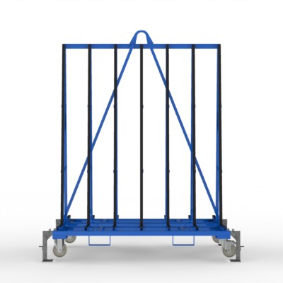 Glastransport- und Kommissionswagen für beidseitige Beladung, ausgestattet mit Polyamid Lenk- und Bockrollen in verstärkter Ausführung, kranbar und staplerfähig