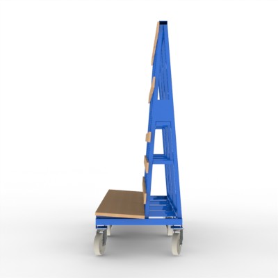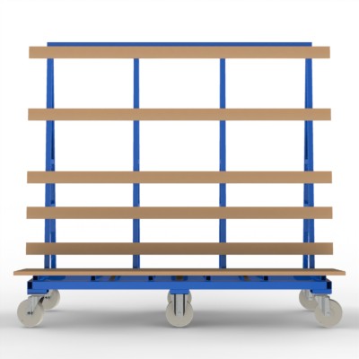 Jumbo Rollwagen für Glastafeln in den Größen bis max. 3.210 x 2.450 mm, ausgestattet mit einer Mittelachse und Schwerlast – Lenkrollen.