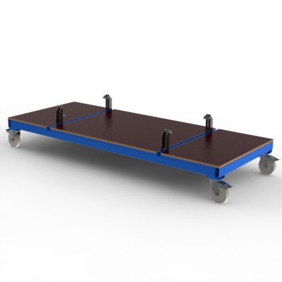 Schwerlast Vario-Unterwagen für Glas- und Fenstertransportgestelle, für den internen Gestelltransport, durchgehendem Holzboden aus 22 mm Siebdruckplatte vorgrüstet für den Einsatz von Halteklemmen (Haltebtratze).