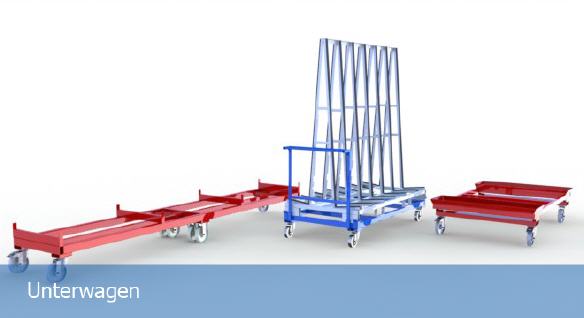 Unterwagen für Glas- und Fenstertransportgestelle, für den internen Gestelltransport.
