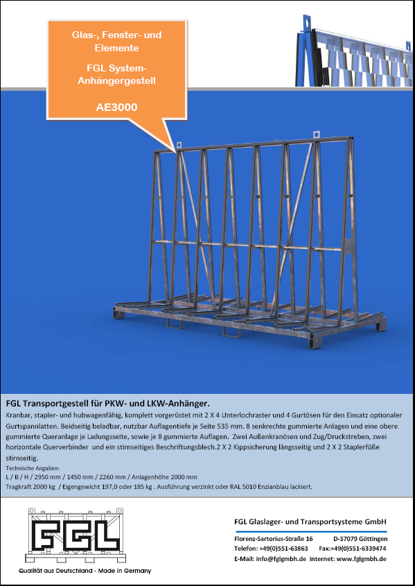 Anhängertransportgestell ___________________________________ FGL AE 3000 L/B/LH: 2950 x 1450 x 2000 mm Tragkraft: 2.000 kg RAL 5010 Enzianblau oder verzinkt |