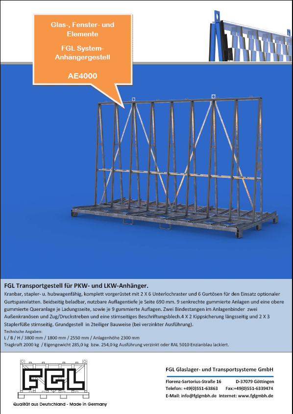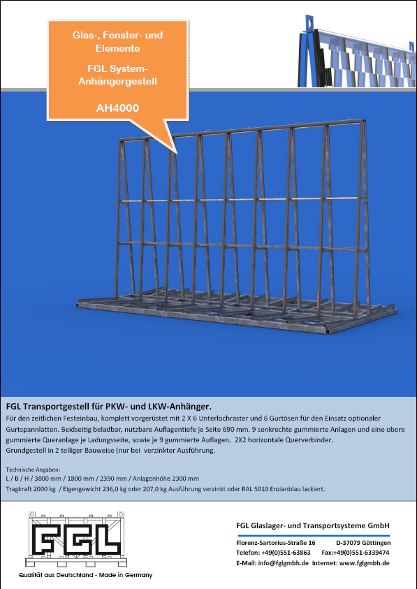 Anhängertransportgestell ___________________________________ FGL AH 4000 L/B/LH: 3800 x 1800 x 2300 mm Tragkraft: 2.000 kg RAL 5010 Enzianblau oder verzinkt |