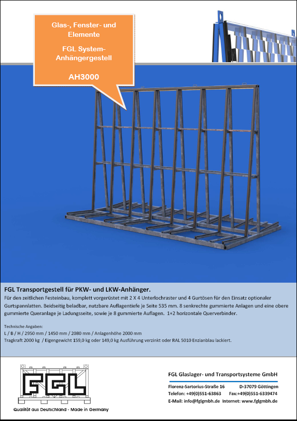 Anhängertransportgestell ___________________________________ FGL AH 3000 L/B/LH: 2950 x 1450 x 2000 mm Tragkraft: 2.000 kg RAL 5010 Enzianblau oder verzinkt |