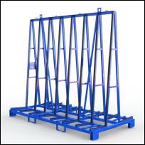 Fenstertransportgestell für beidseitige Beladung, kranbar, staplerfähig mit Kippsicherungen und mit Unterlochraster vorgerüstet für den Einsatz von Gurtspannlatten.