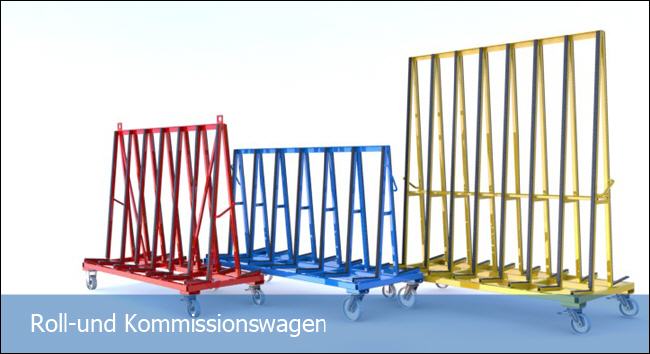 Roll-und Kommissionswagen, 3000 mm lang beidseitig beladbar bis 3250 mm. Grundrahmen vorgerüstet zur Aufnahme von Glasspannhaltern. Ausführung mit verbreitertem Oberholm. |