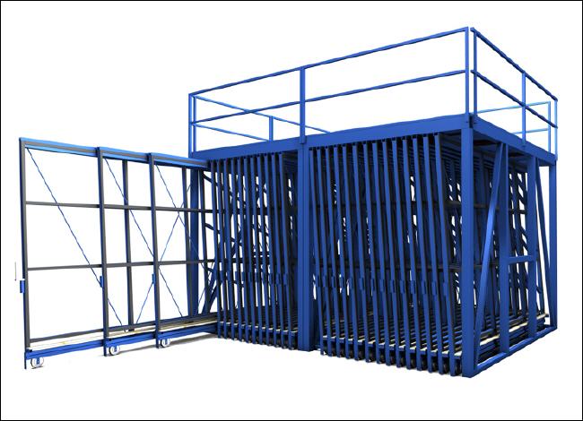 FGL Schubfachlager für Glaspakete und Glastafeln bis 3,21 x 2,25 bestehend aus 1 Einzelrahmen mit 16 Fächerschlitten. |
